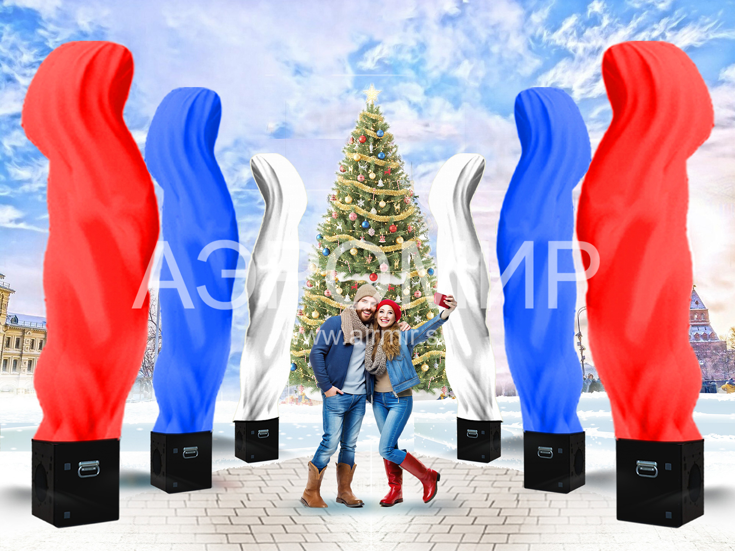 Аэрофонтан – это пример динамичного, а значит нескучного оформления праздничной площадки. Если Вы не представляете, что это такое, вспомните любой из увиденных когда-либо фонтанов. Как известно, он образуется, когда вода встречается с препятствием и из-за давления, создаваемого искусственно или естественно, устремляется вверх. Если заменить воду воздухом и ограничить его поток «трубой» из синтетической ткани, получится фонтан воздушный. Благодаря тому, что используемый материал, как правило, имеет очень гладкую, блестящую поверхность, на струящейся оболочке возникают переливы и блики, как на воде. Этот эффект заметно усиливается в вечернее время, когда можно включить встроенную подсветку.